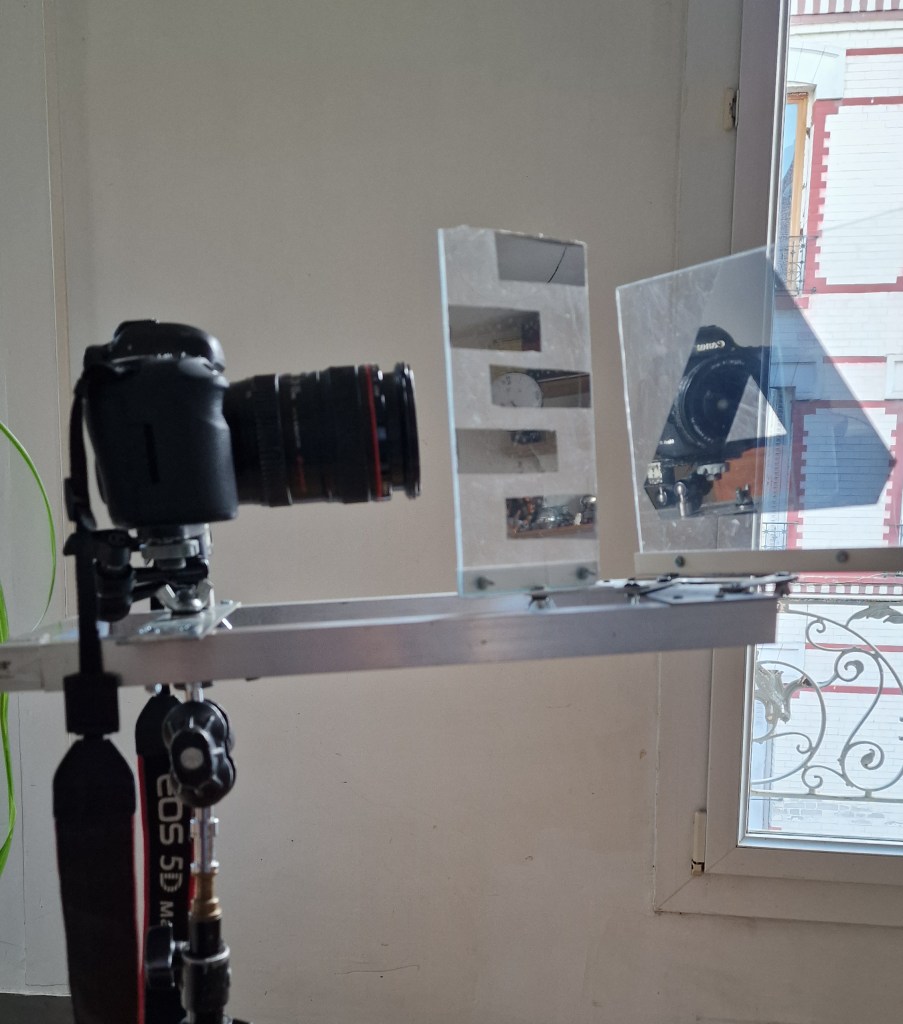 À l’instar de ces derniers années, j’ai créé un dispositif mi-numérique mi-analogique. Mon intention est de travailler sur le cadre en y intégrant le hors-cadre et modifiant ainsi le hors-champ, ou l’espace imaginaire prolongeant le visible. J’utilise une caméra numérique devant laquelle je place des surfaces translucides et miroirs me permettant ainsi de jouer avec le hors-cadre. J’ai donc construit deux dispositifs, un adapté à mon appareil photo réflex pour des situations posées, et un autre adapté à mon téléphone me permettant d’être plus léger et plus discret.